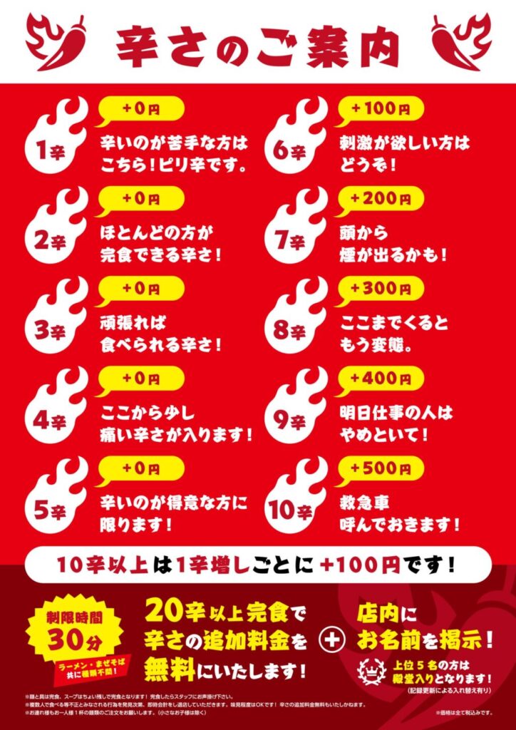 店内には20辛以上を完食した猛者たちの名前が飾られていて、10辛には「救急車レベル」なんて恐ろしい注意書きも……!